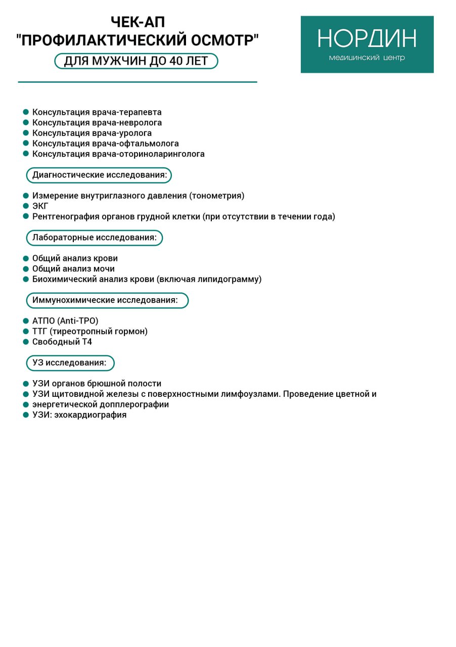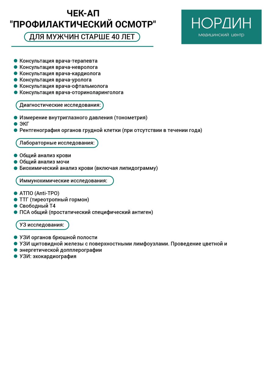 Для мужчин старше 40 лет список дополняется специфическими исследованиями, такими как, например, анализ на ПСА для скрининга заболеваний предстательной железы.