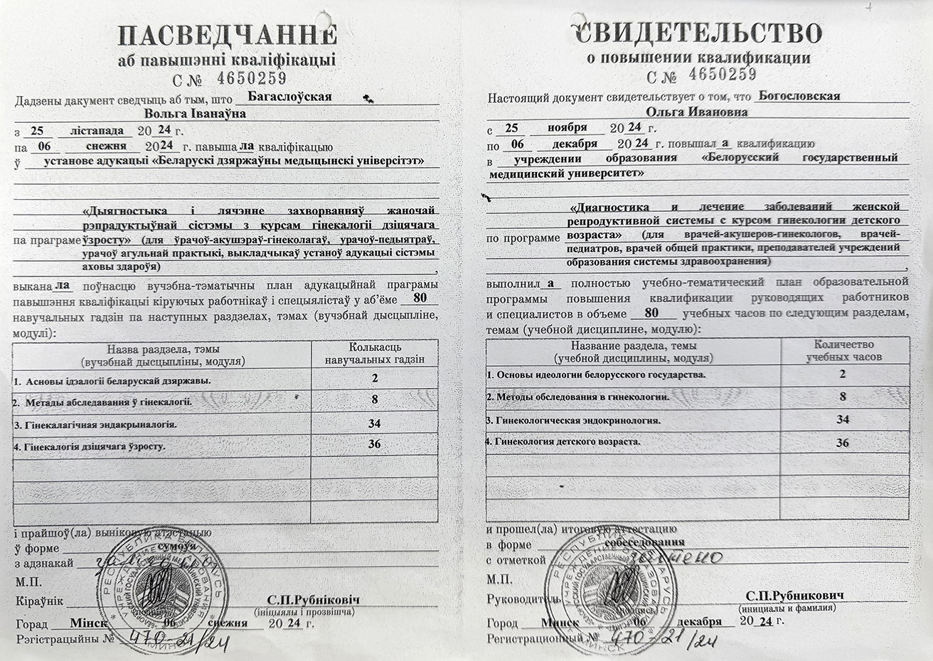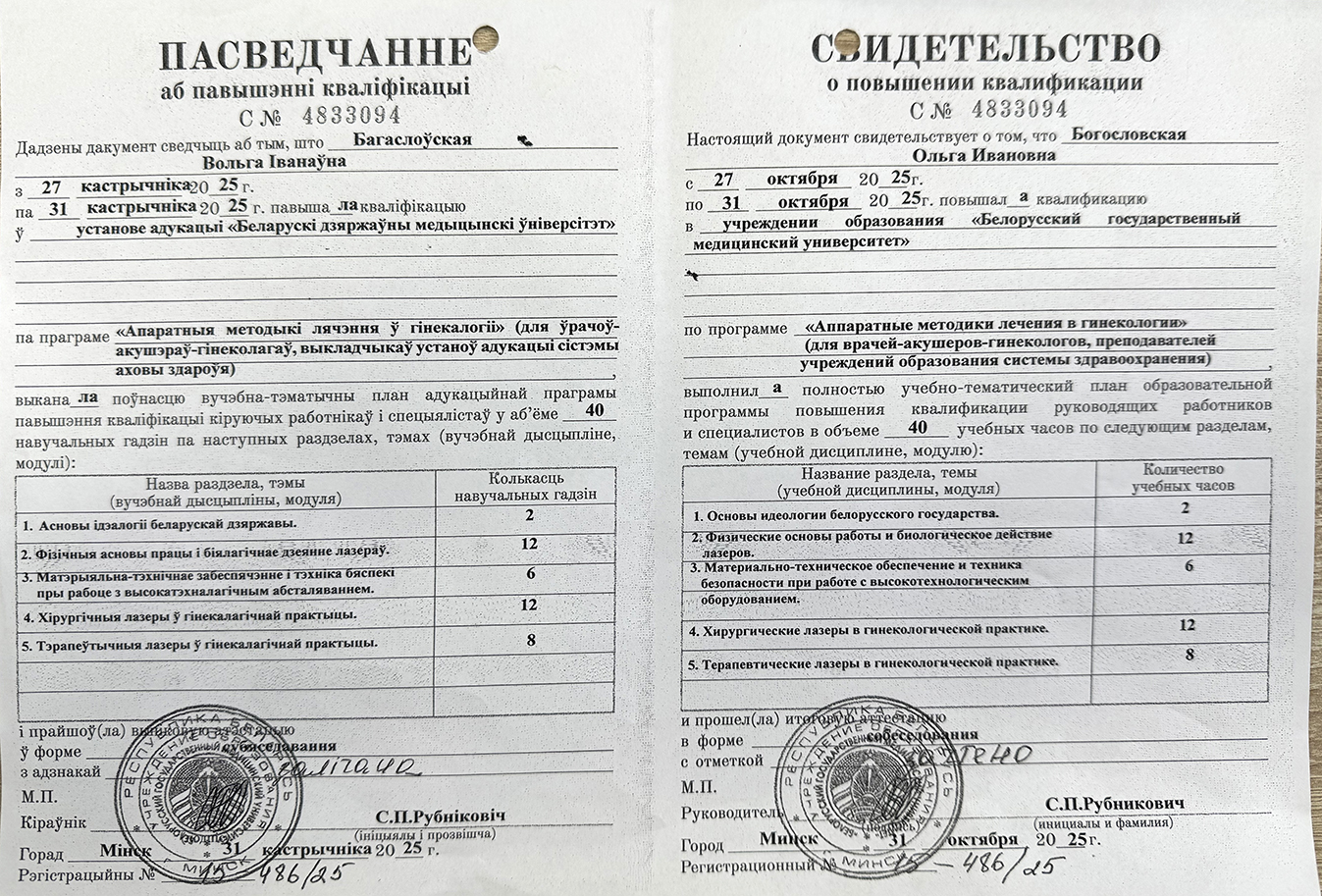 1999-2000 гг. проходила стажировку в УЗ «Клинический областной Родильный дом № 2» г. Витебска по специальности «Акушерство и гинекология», присвоена квалификация «Акушер-гинеколог».