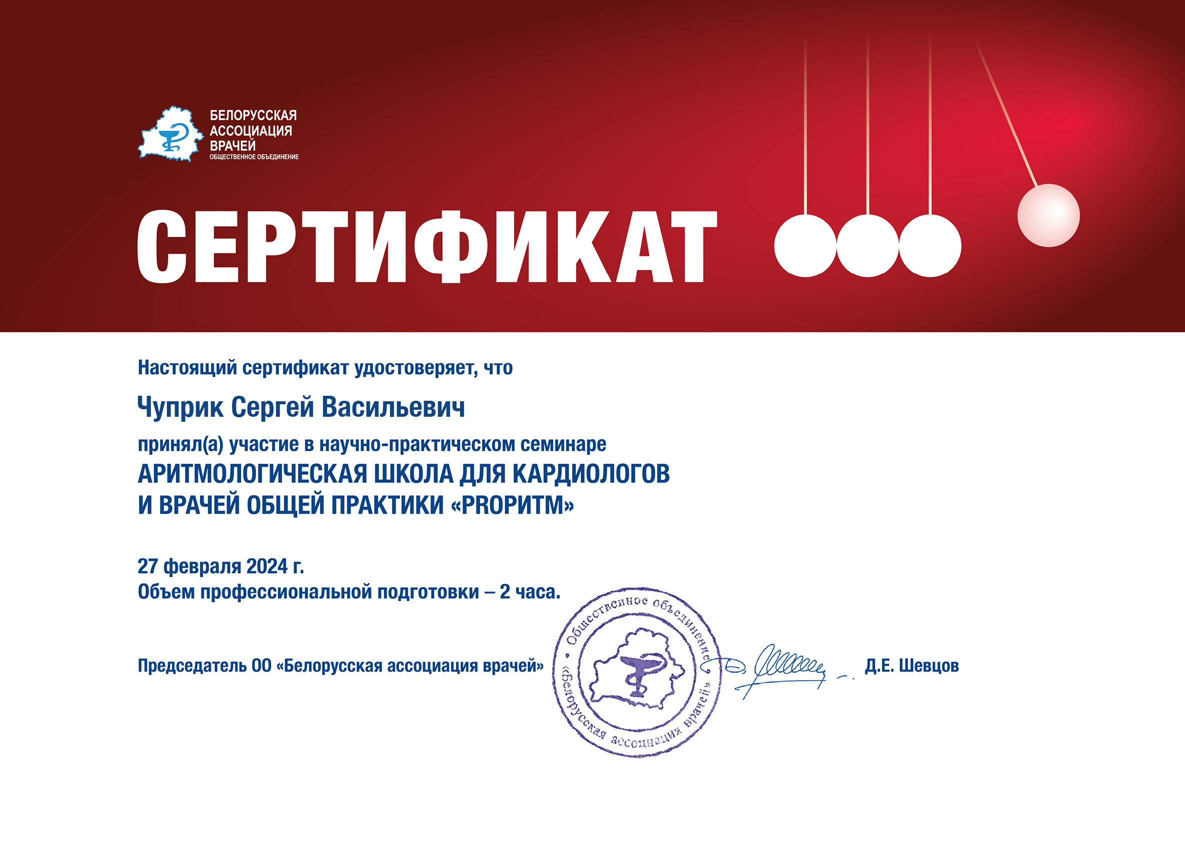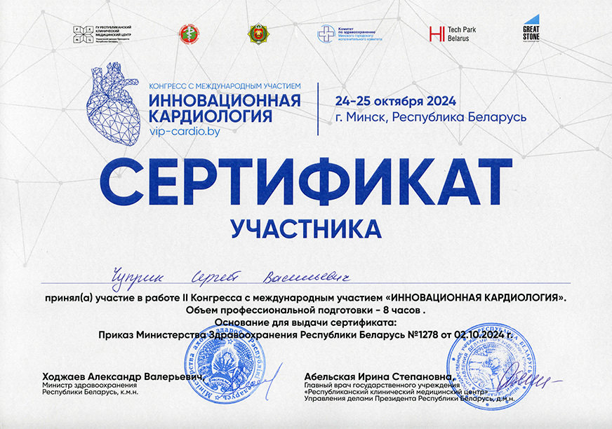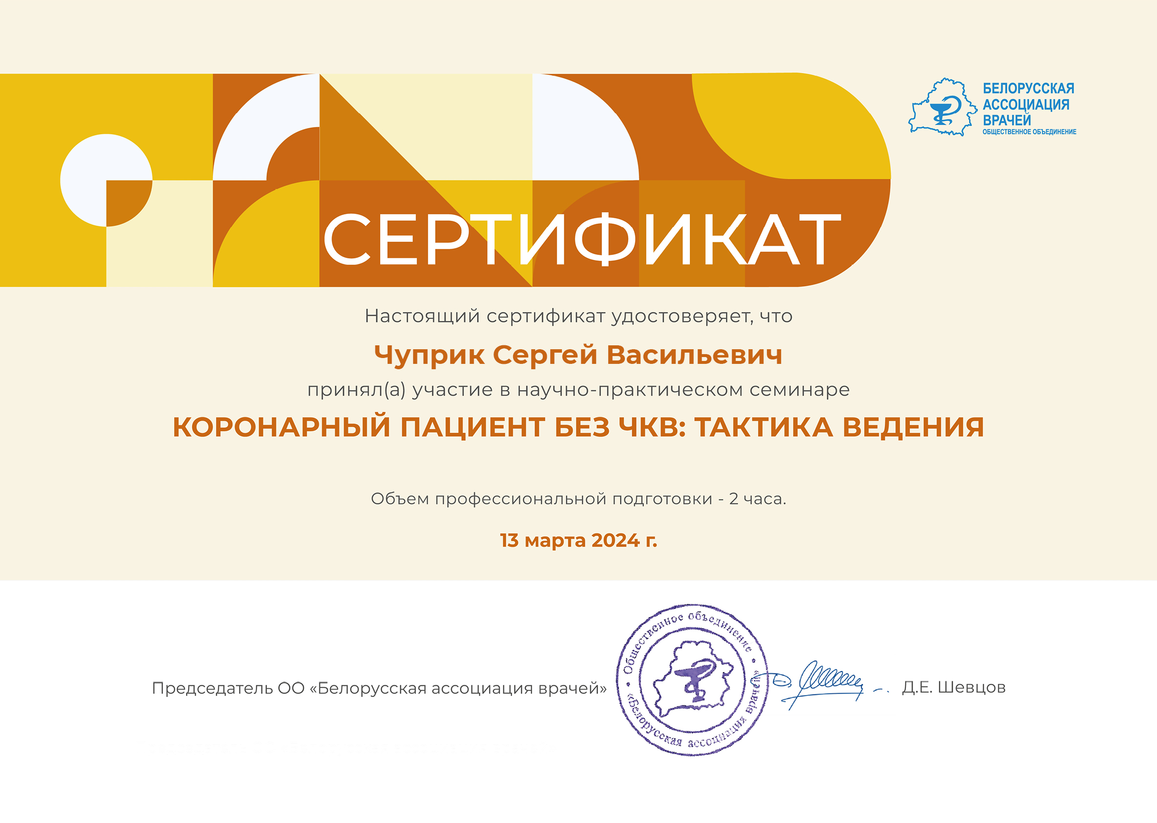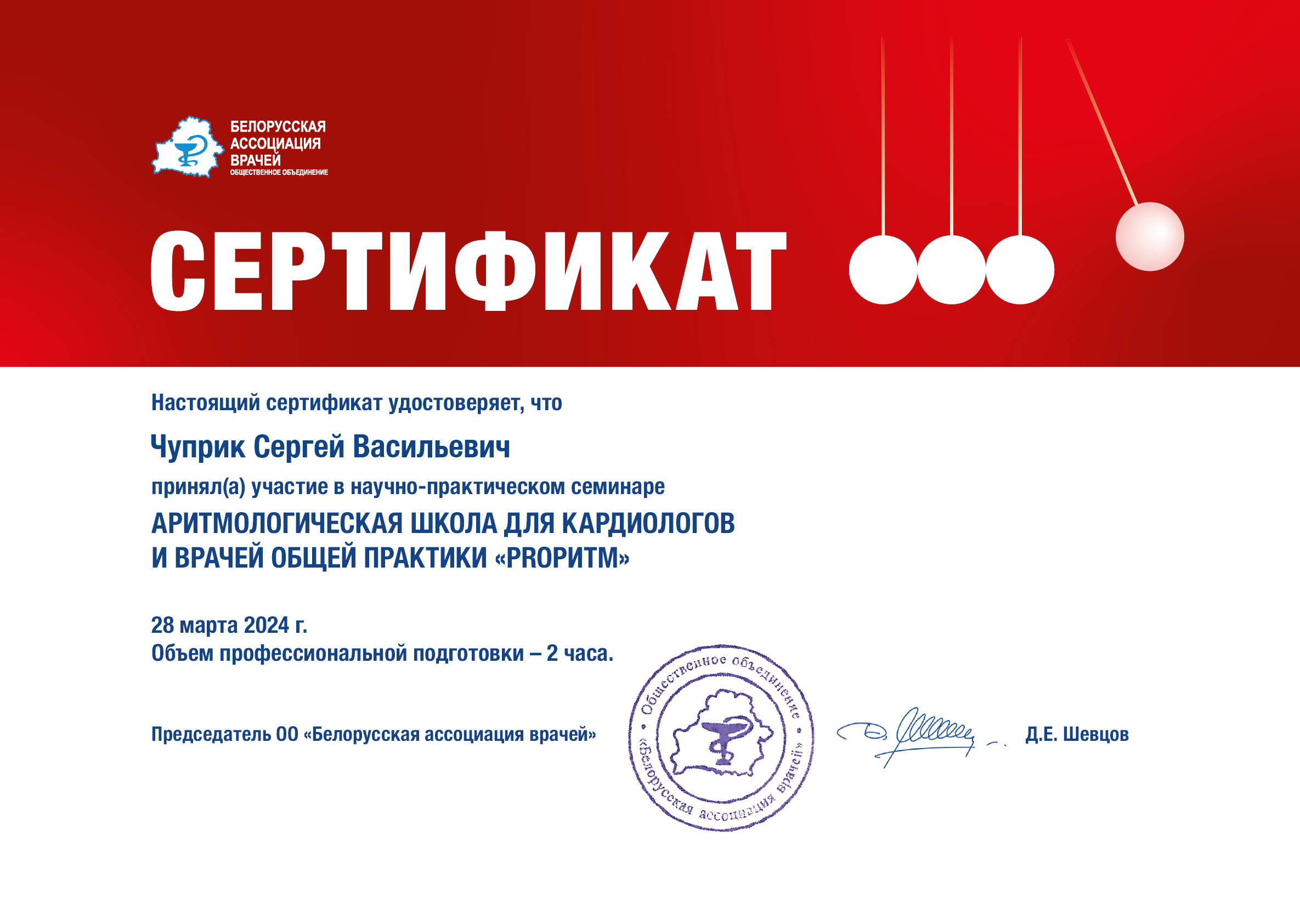 Благодарность Хочу выразить огромную благодарность врачу-кардиологу Чуприку Сергею Васильевичу! Замечательный, внимательный, очень вежливый, высокопрофессиональный доктор! Внимательно меня выслушал, дал важные рекомендации, назначил полное обследование, все очень доступно разъяснил. Огромное спасибо Сергею Васильевичу! Буду и далее проходить обследования и лечение у Чуприка Сергея Васильевича.