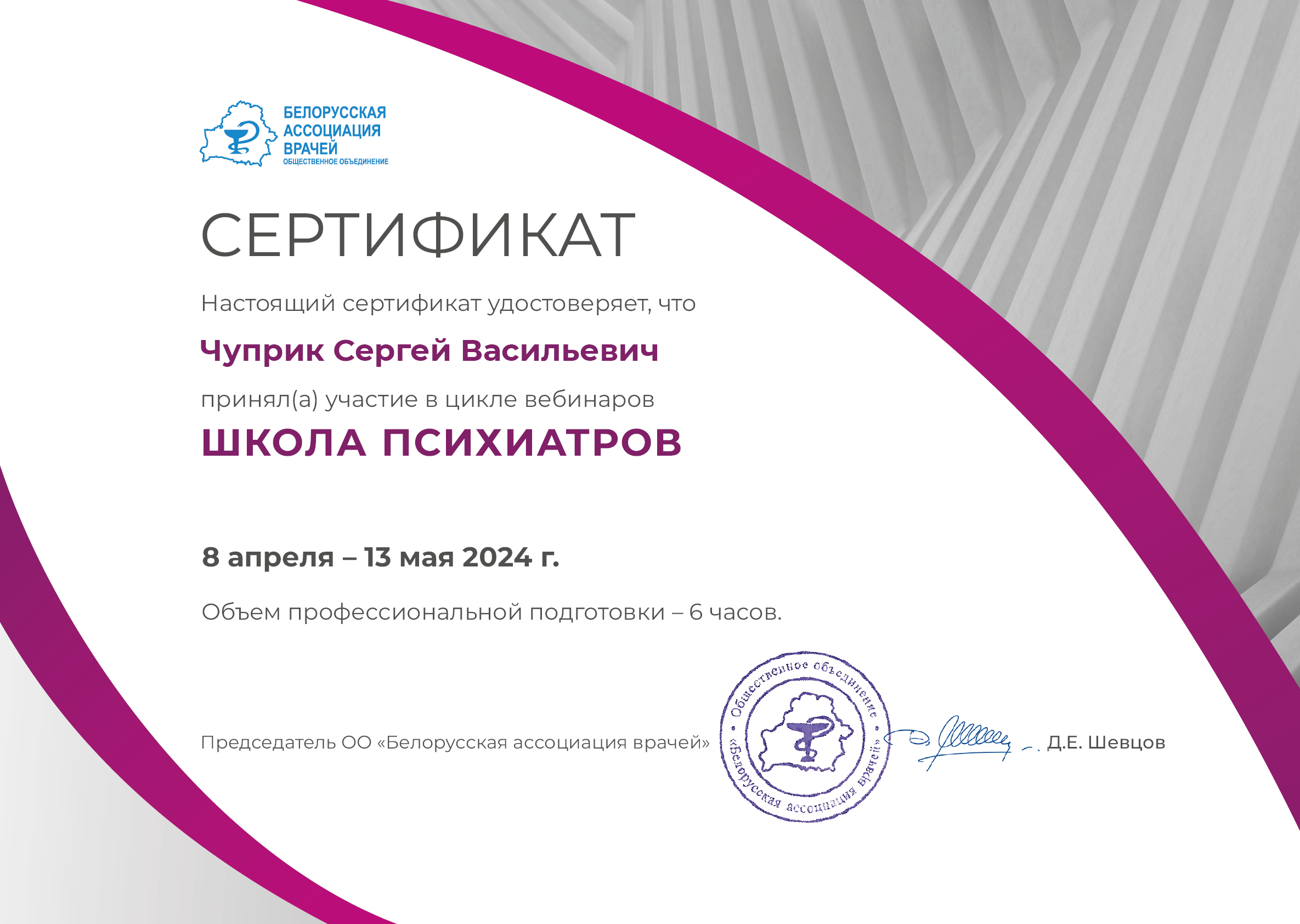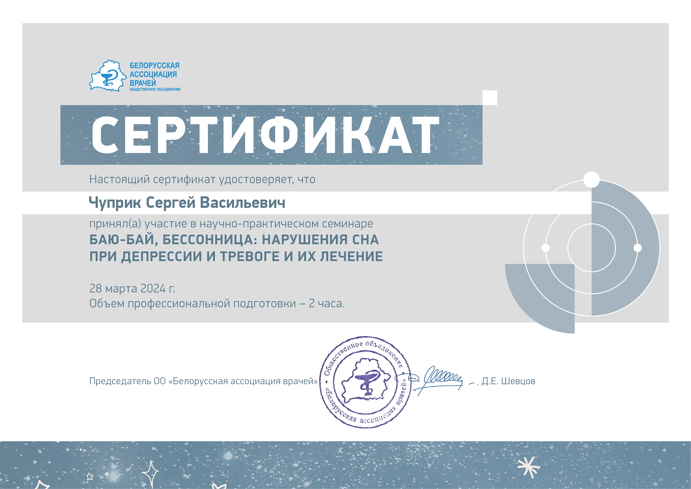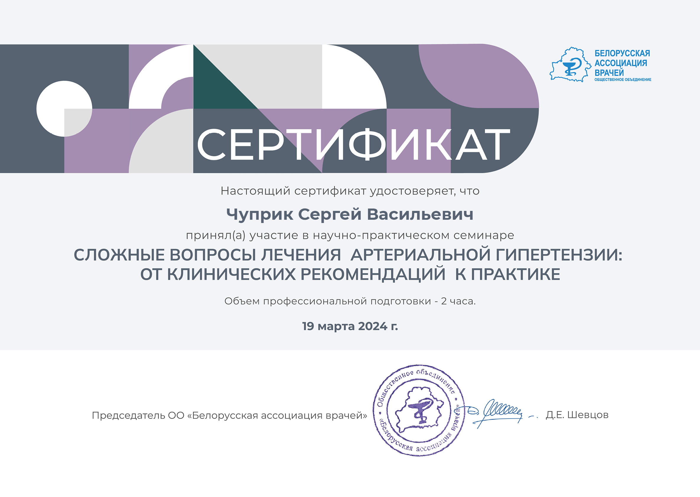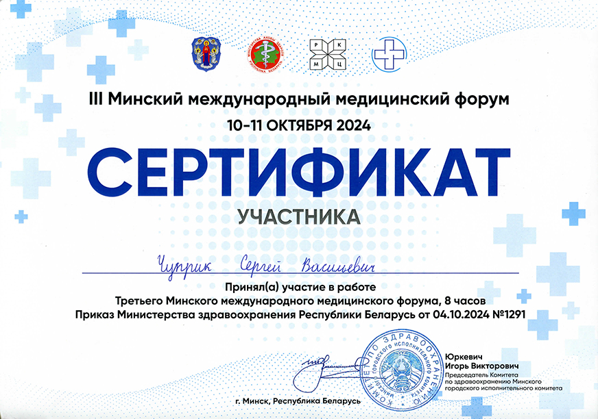 ОГРОМНАЯ БЛАГОДАРНОСТЬ ЗА ПРОФЕССИОНАЛИЗМ 08.08.2023 мой визит к Сергею Васильевичу Чуприку был третьим. Предложенная методика лечения в июне, уже при повторном посещении в июле подтвердила правильное направление. Сегодняшний визит — только тому подтверждение! Были предложены медицинские препараты нового поколения, план лечения с указанием времени приема лекарств, план обследования, рекомендации. Сергей Васильевич! Спасибо Вам большое за профессионализм, внимание, чуткость! С уважением, Галина Ивановна.